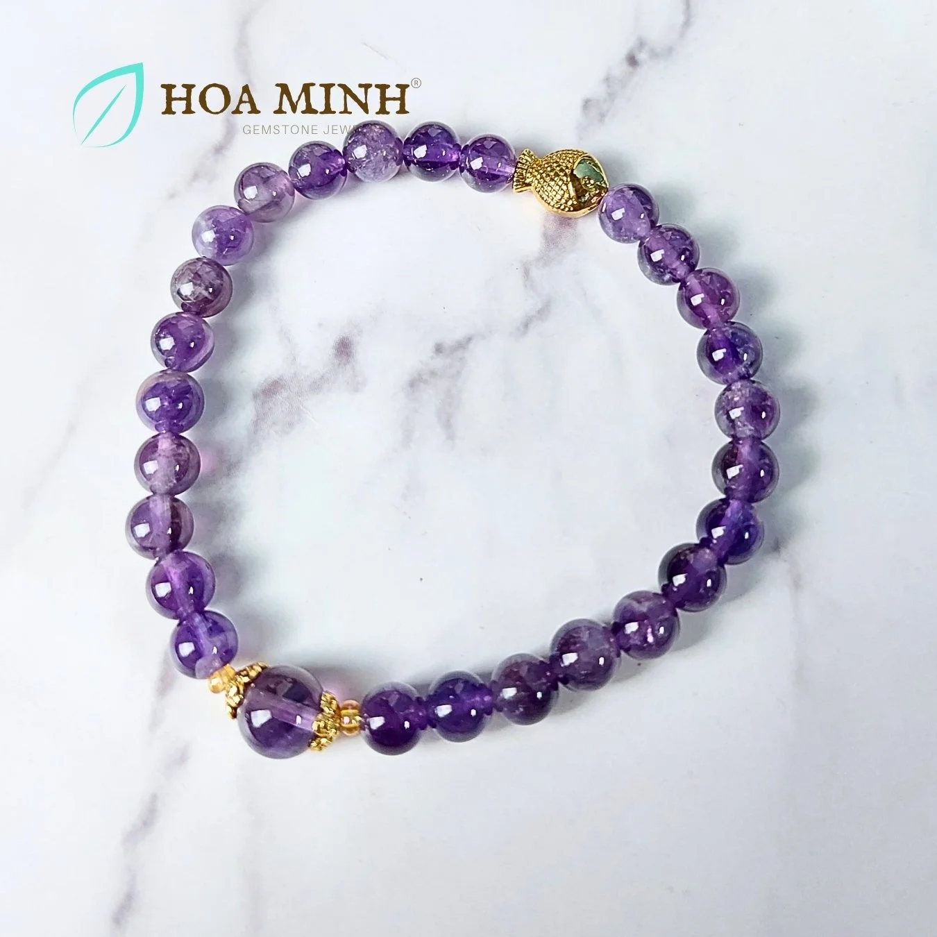 Vòng tay đá Thạch Anh Tím Amethyst tự nhiên size hạt 6.5 li phối charm cá chép vàng, charm ốp hoa sang trọng